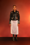 Falda rosa con caida en corte recto, que lleva blondas romanticas a los costados, dandole un toque femenino y elegante.