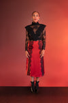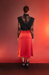 Falda rosa con caida en corte recto, que lleva blondas romanticas a los costados, dandole un toque femenino y elegante.